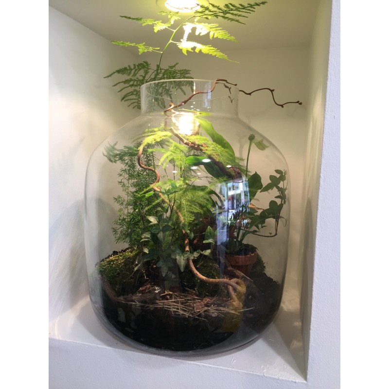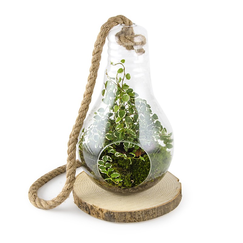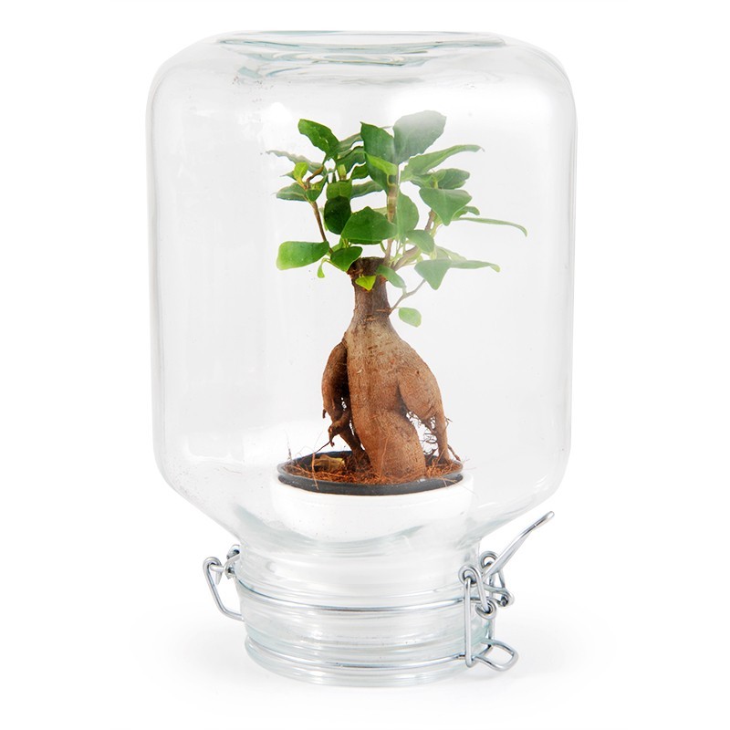 Avec ses racines qui remontent en dehors du pot, le ficus Ginseng porte sa belle allure dans cette ampoule végétale. Le bocal coince le pot et sert de terrarium fermé pour la plante qui n'a plus besoin d'arrosage.