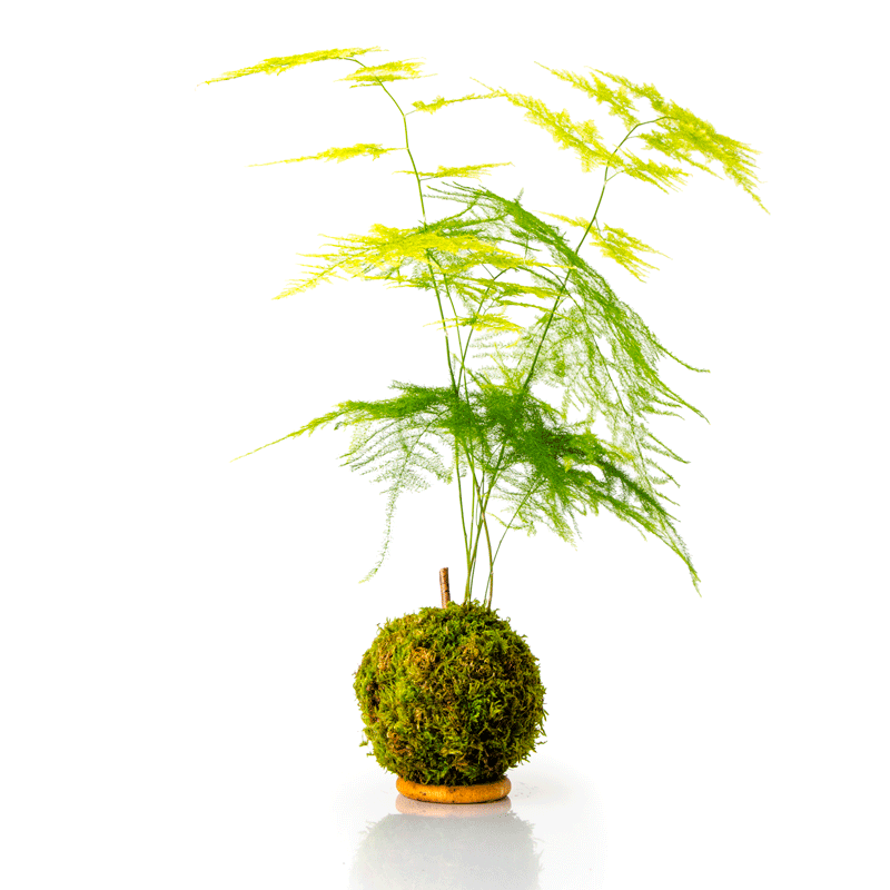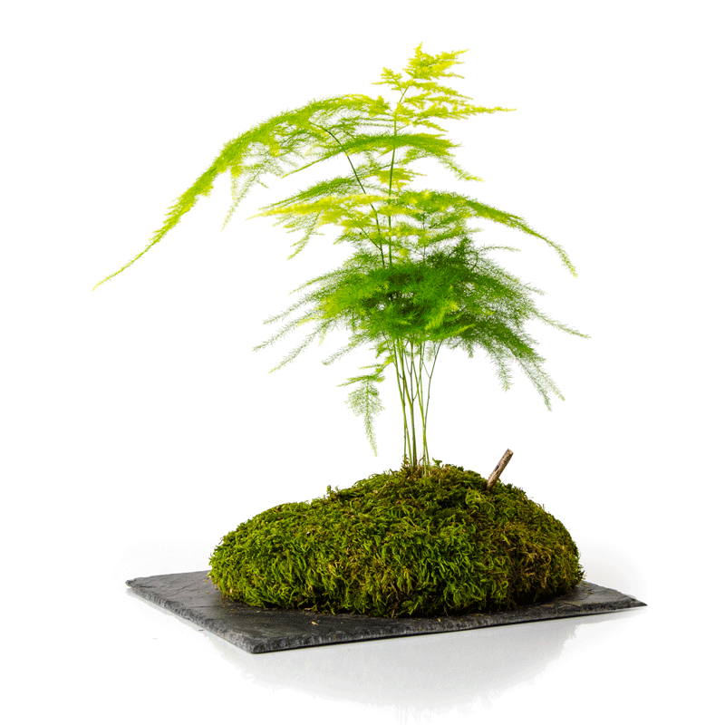 Regardez cette plante vaporeuse comme poussé sur un rocher de mousse !Un petit paysage est recrée sur une ardoise naturelle avec un asparagus plumosus qui donne l'impression de vouloir s'envoler et caresser les nuages