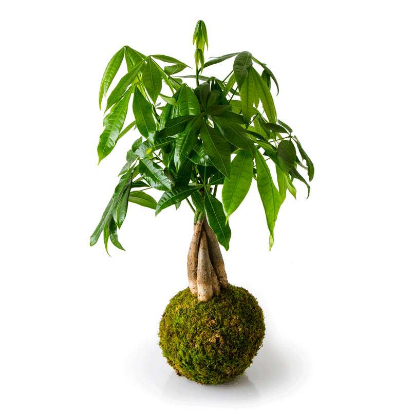 Le Pachira est une belle et grande plante d'intérieur au tronc tressé  avec patience, et il faut bien une "boule de mousse" taille matsuda pour équilibrer la composition, et mettre en valeur cette plante originale.